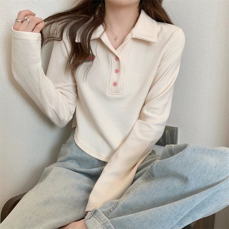 大码不规则polo领长袖T恤女秋季韩系修身显瘦遮肚子短款上衣