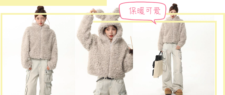 秋冬兔耳朵连帽毛绒开衫外套女秋冬小个子加厚保暖短上衣可爱