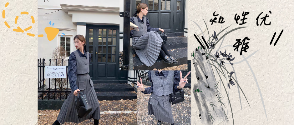 美院生 气质羊毛呢马甲背心女款百褶灰色长款半身裙