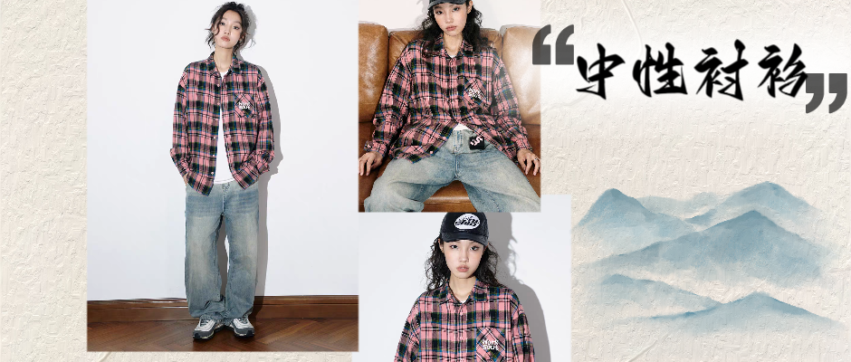 刺绣破洞粉色格子衬衫男女美式复古宽松夹克秋季