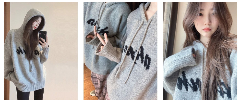 WEIZIMAN美式复古字母长袖连帽针织毛衣女秋冬季宽松中长款上衣 加绒 灰色 M