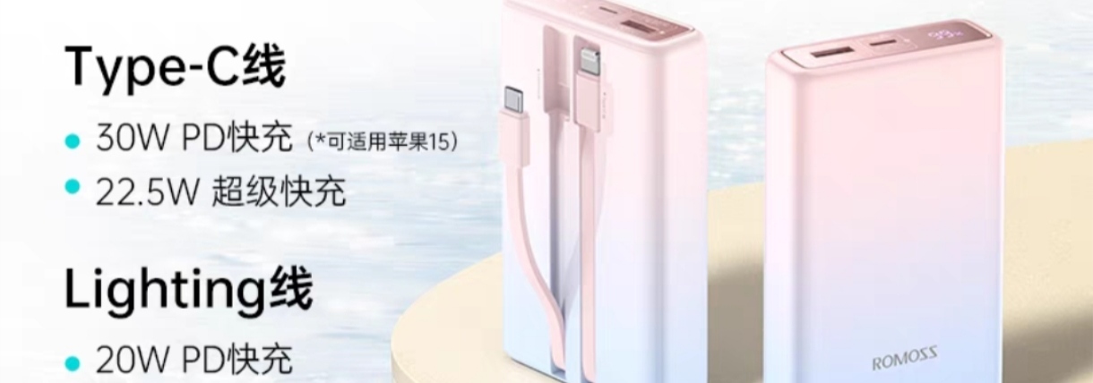 罗马仕20000毫安充电宝双自带线双向快充大容量闪充1万小巧移动电源闪充适用华为小米oppo苹果