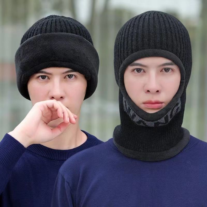 冬季男士帽子一体毛线帽加绒加厚保暖套头骑车护耳防风纯色针织帽