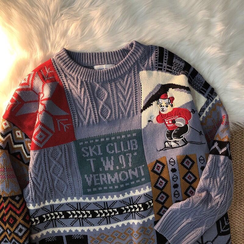 圣诞节港风复古小熊毛衣男士加厚慵懒风宽松秋冬情侣装毛线衣服潮