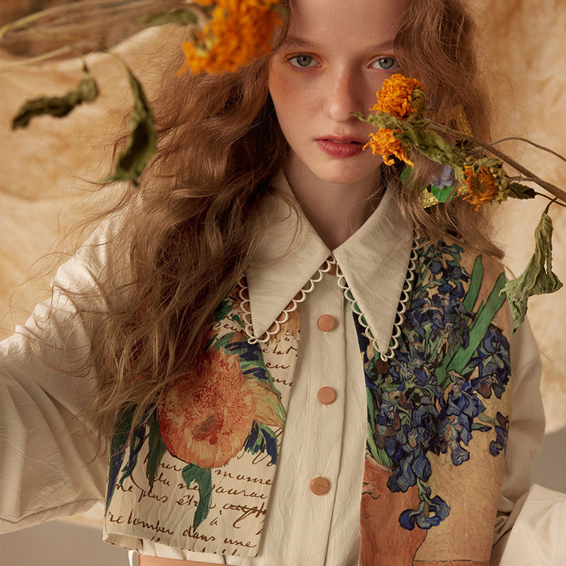 两三事梵高文艺天生艺术家2023冬季新款印花拼接假两件绑带连衣裙