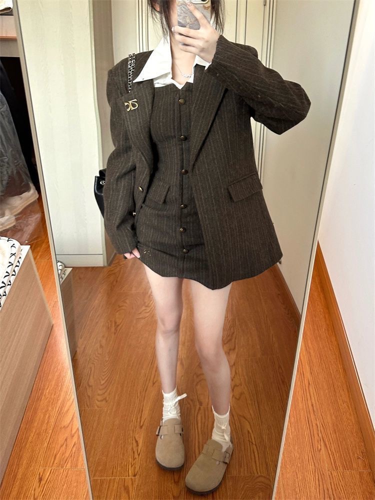 复古高级感毛呢西装外套冬季新款时尚假两件衬衫连衣裙两件套装女