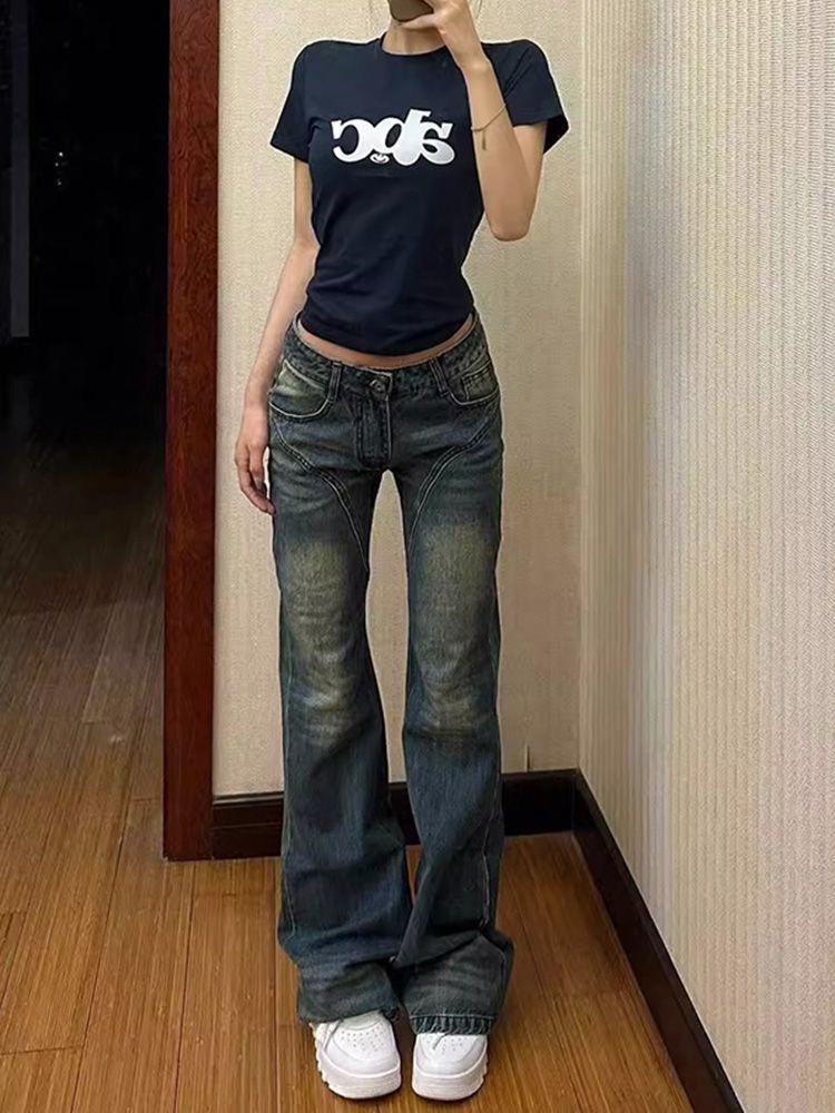 美式复古辣妹低腰牛仔裤女秋冬新款宽松阔腿显瘦微喇直筒拖地裤子