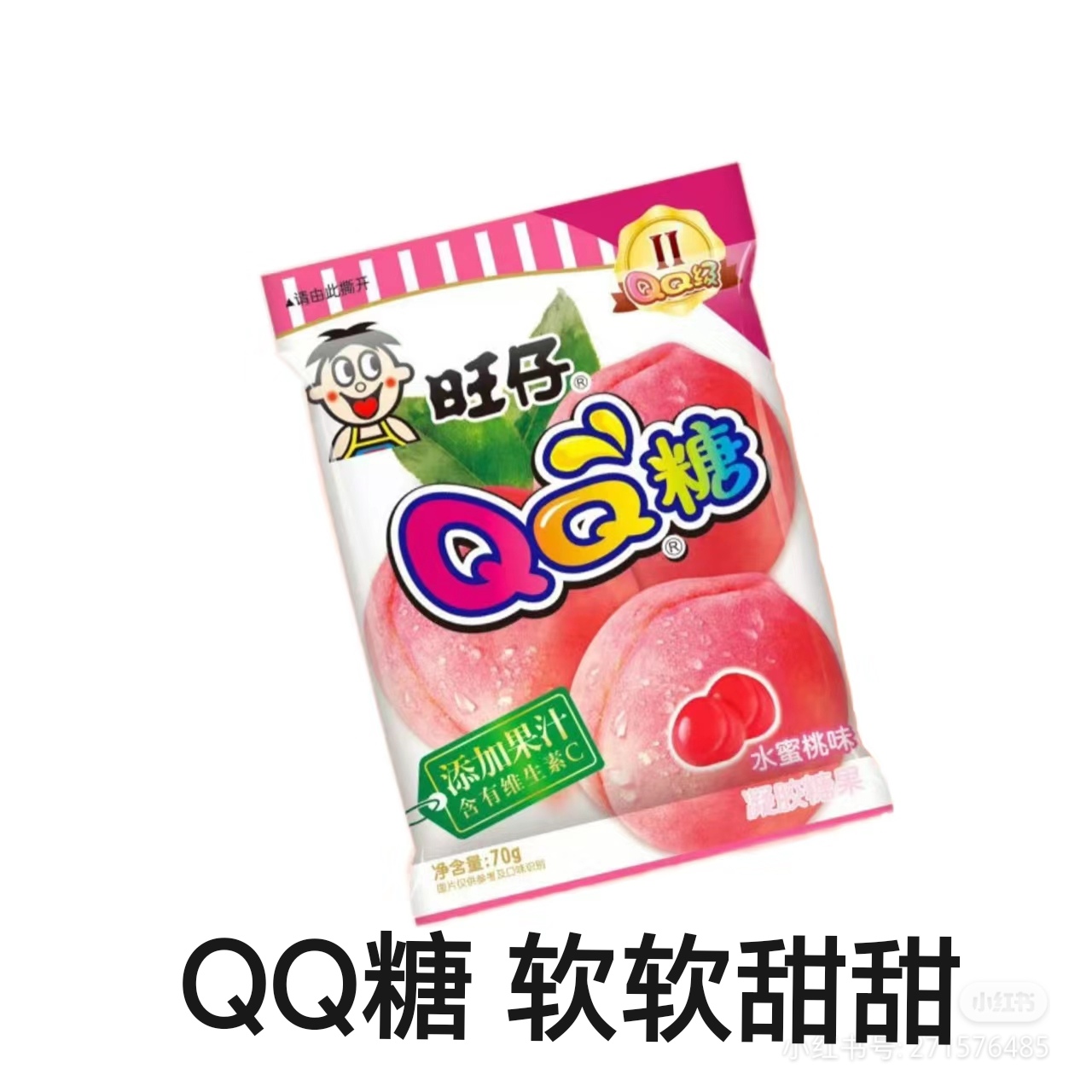 旺仔QQ糖,旺仔公司出的一种糖由白砂糖、明胶、柠檬酸、葡萄糖等配料做成的软质糖果,有不同的风味:草莓味、荔枝味、水蜜桃味、香橙味、菠萝味、青苹果味、蓝莓味、葡萄味、可乐味。属于软性胶状糖果。