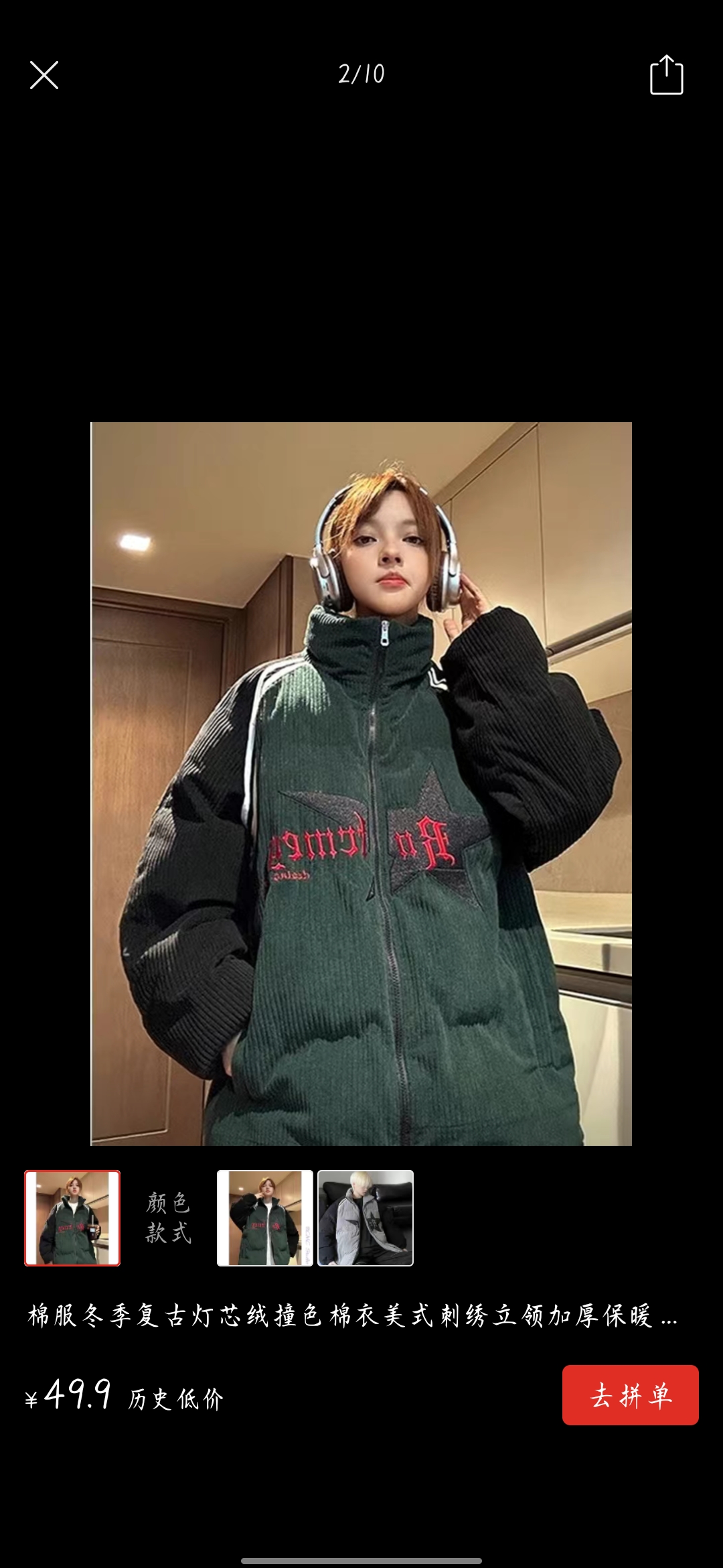 棉服冬季复古灯芯绒撞色棉衣美式刺绣立领加厚保暖宽松学生棉袄女