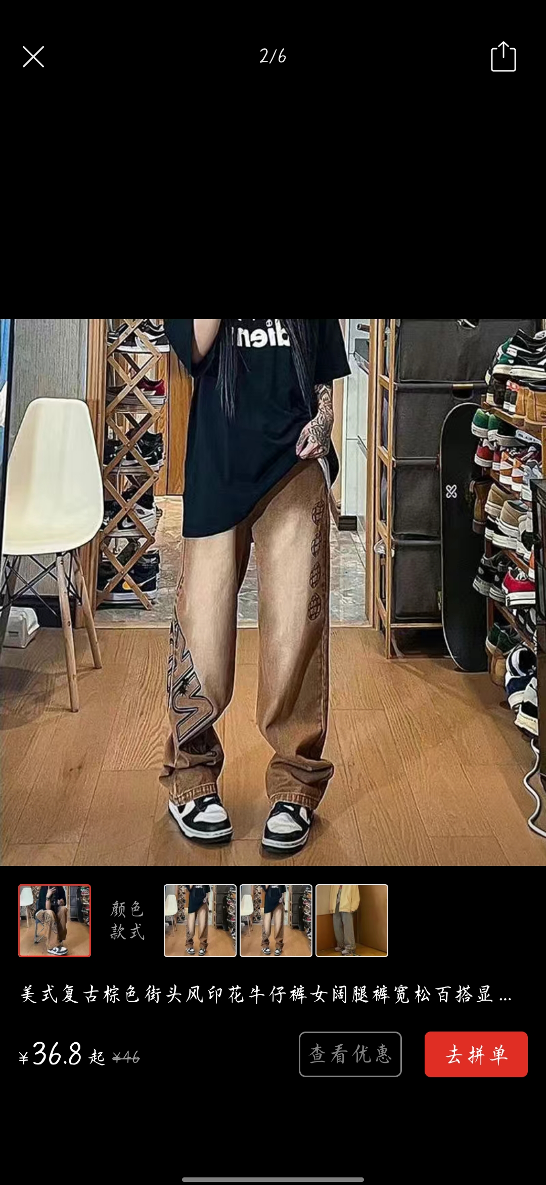 美式复古棕色街头风印花牛仔裤女阔腿裤宽松百搭显瘦高腰拖地裤子