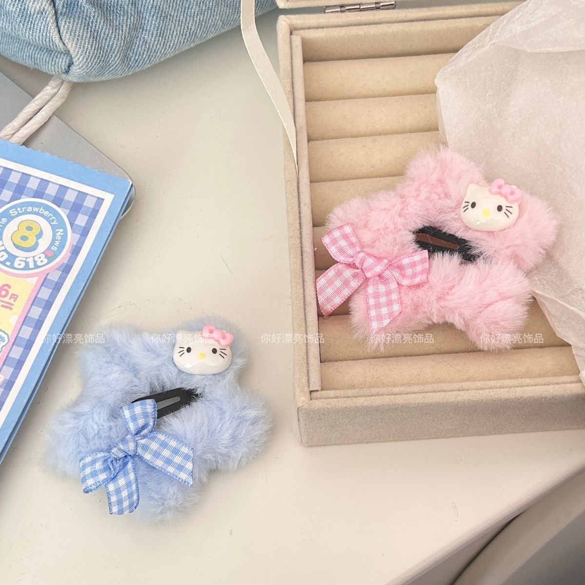 毛茸茸星星kt猫格子蝴蝶结发夹甜美秋冬五角星卡通发饰