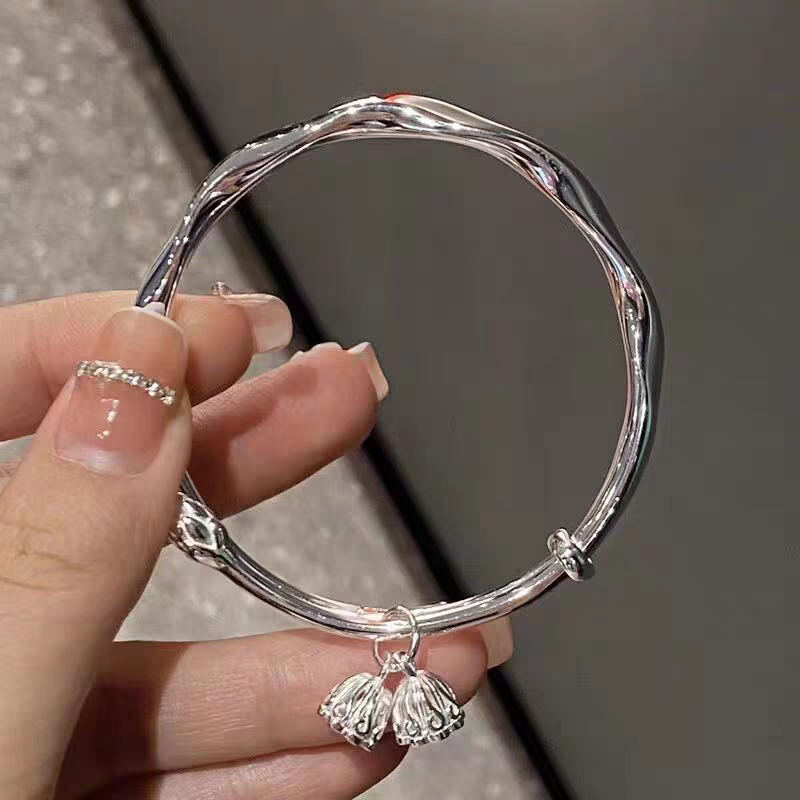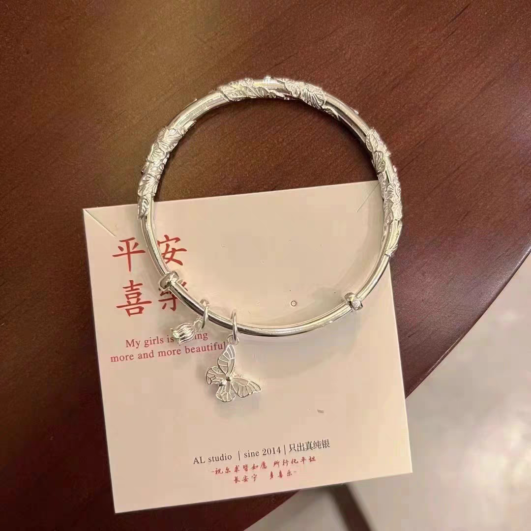 新款纯银s999碧玉繁花似锦银手镯足银实心开口