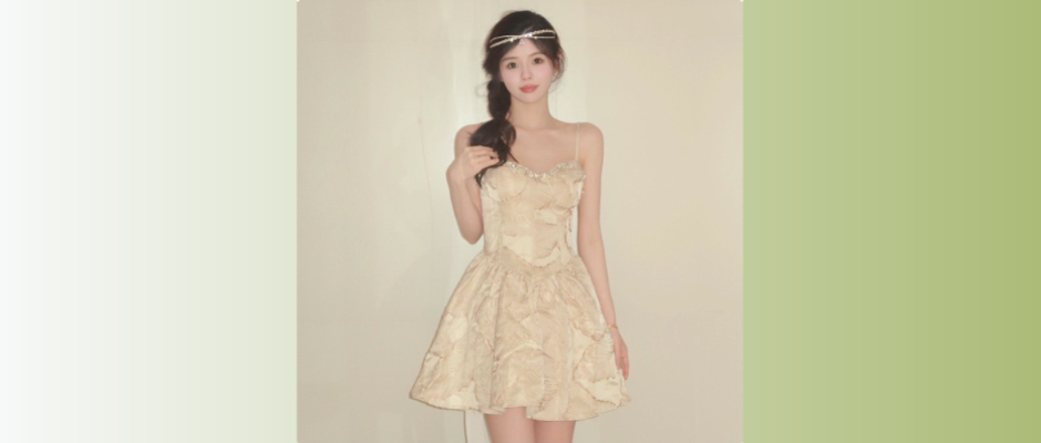新中式国风法式富家千金花苞吊带连衣裙 米杏色