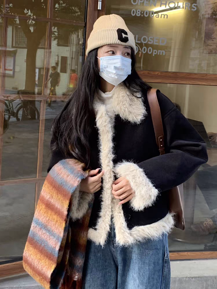 黑色灯芯绒羊羔毛外套女短款秋冬新款高级感加厚夹棉拼接毛绒棉服