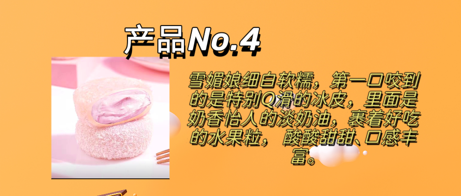 ①可以代替早餐,方便食用 ②该点心细白软糯、口感酸甜、清凉冰爽、晶莹剔透。 ③雪媚娘细白软糯,里面是奶香怡人的淡奶油,裹着好吃的水果粒