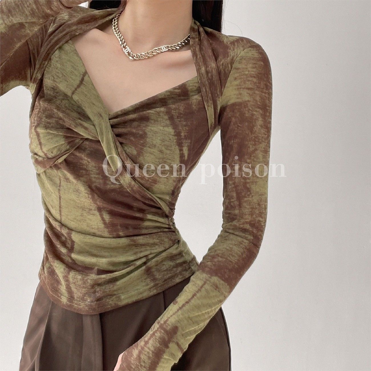 狂野辣妹晕染v领交叉防晒长袖T恤女复古修身显瘦短款褶皱包肩上衣