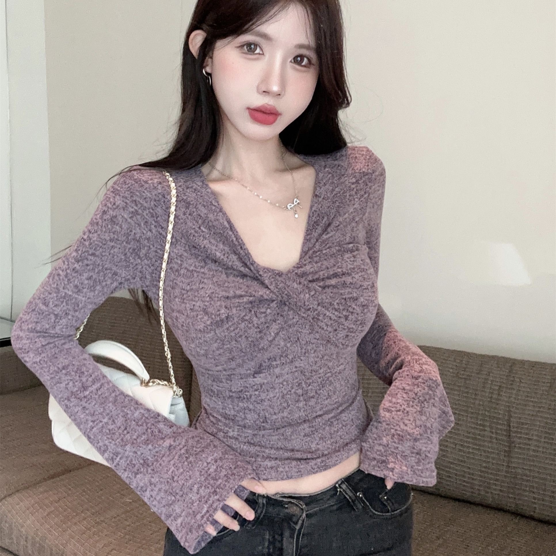 秋季辣妹百搭t恤女小众显瘦V领设计感纽结长袖打底衫气质短款上衣