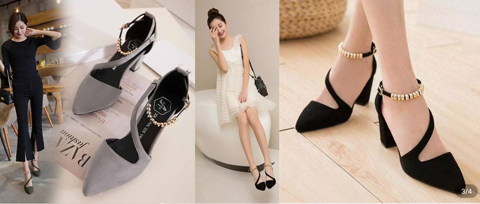 尖头粗跟高跟鞋一字扣单鞋 性感窜珠脚链高跟浅口凉鞋女鞋