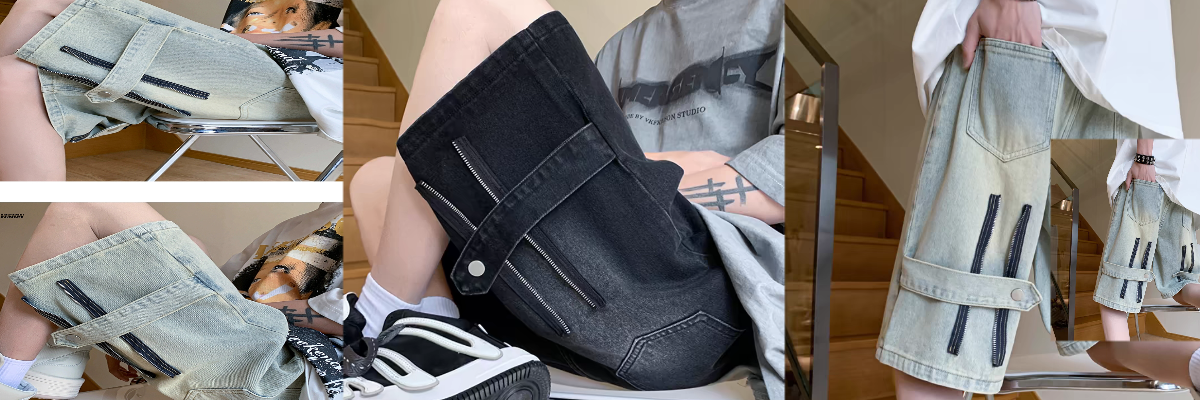 黄牛仔短裤男女夏季美式复古五分裤潮牌高街设计感拉链裤子工装