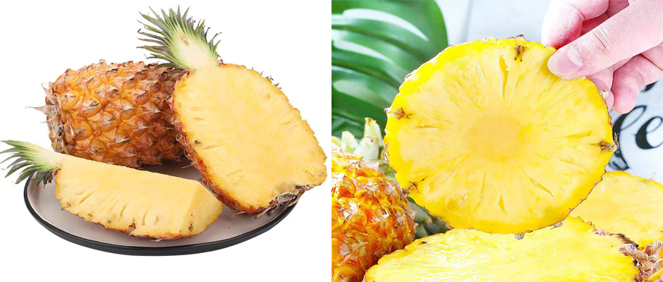 树上自然熟削皮即食金黄的果肉香甜多汁,不用挖眼果芯小果味浓纤维少,不塞牙不涩口,甜度达18°,比普通凤梨甜十倍,无需泡水不麻嘴,果大多汁,口感清甜脆嫩,咬一口汁水四溢