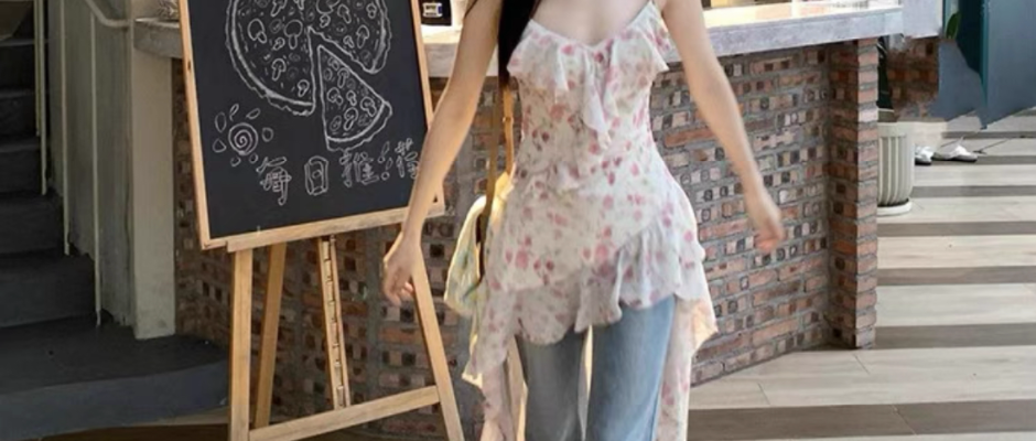 法式小众粉色碎花不规则无袖连衣裙子女修身显瘦吊带上衣夏季新款