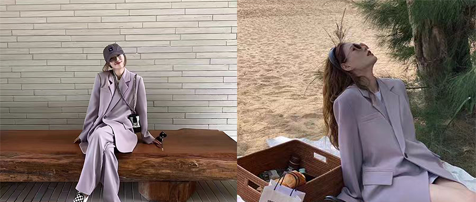 优雅通勤纯色西服套装,优雅平驳领裁剪,复古浅金图案钉扣,点缀衣襟袖口偏宽松休闲的年轻款 从肩膀肩垫到长度围度都有调整上身敲显瘦der~轻垫肩的设计 把肩部的位置修饰得纤瘦能撑得起版型 也不会显得身形壮壮的偏宽松的廓形穿着蛮有腔调的 搭配经典的枪驳领翻领设计整个气场就出来了