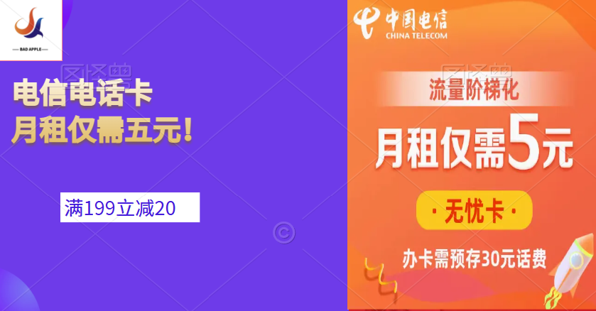 中国电信无忧卡套餐手机号流量电话卡 5元低月租全国通用副卡优选
