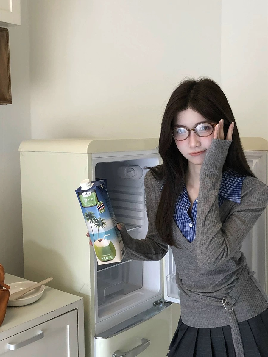 针织衬衫假两件上衣,蓝色格子拼接,蓝色也是衬托的肤色更加显白,衣身面料也是非常有弹性价比高,穿上也是炒级显瘦