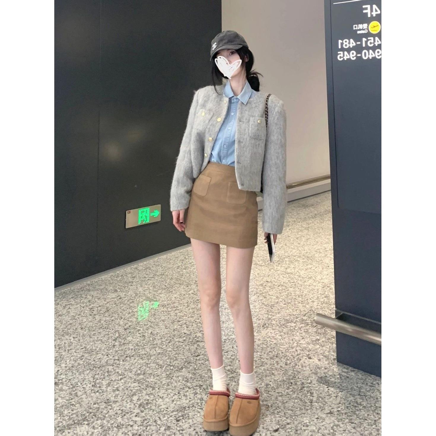 三件套女2023秋冬新款气质小香风短款毛呢外套牛仔长袖衬衫半身裙