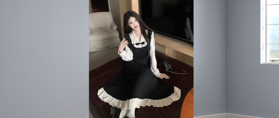 甜美蝴蝶结拼接假两件长袖连衣裙女春秋2024新款显瘦收腰A字长裙