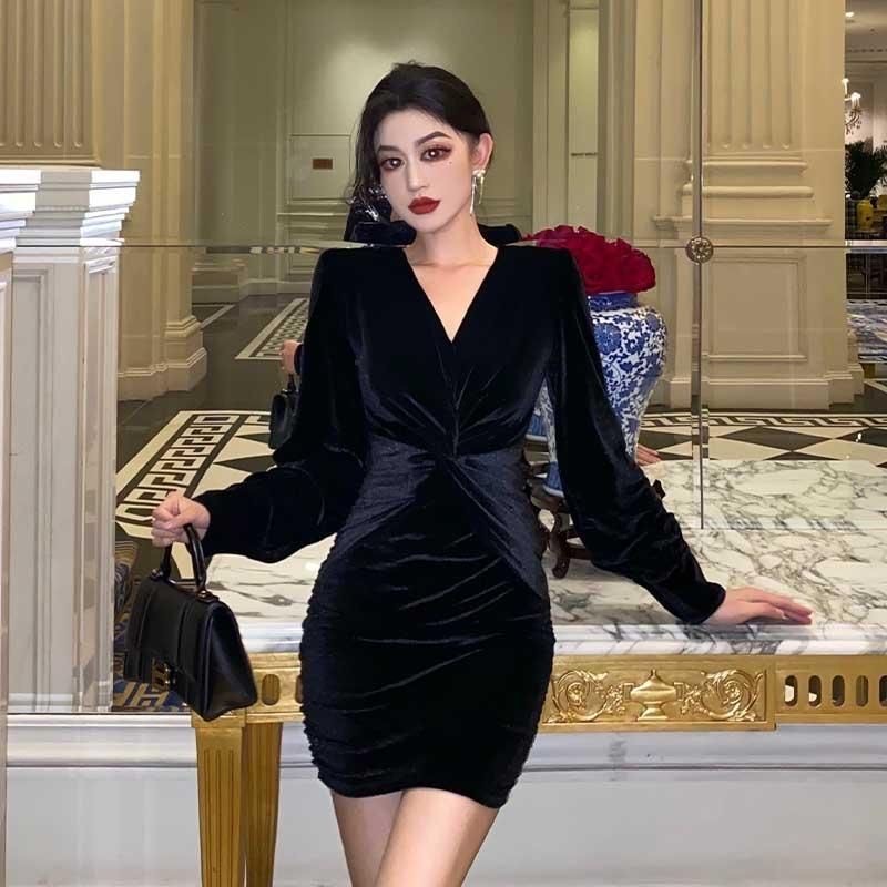 纯欲V领丝绒连衣裙女春秋法式别致氛围感赫本风打底显瘦包臀短裙