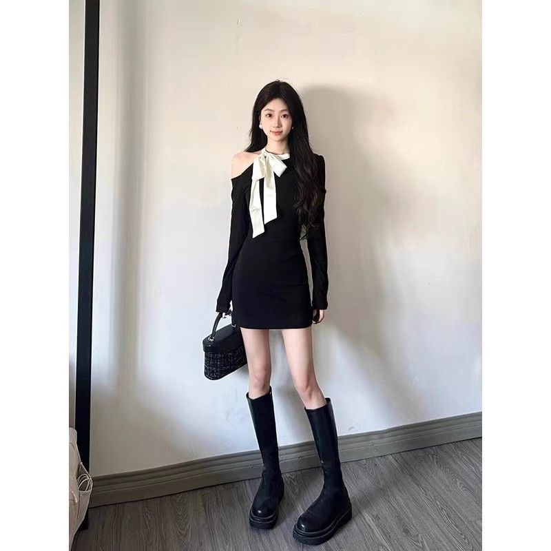 法式绑带长袖露肩名媛黑色气质蝴蝶结秋季辣妹修身连衣裙设计裙子