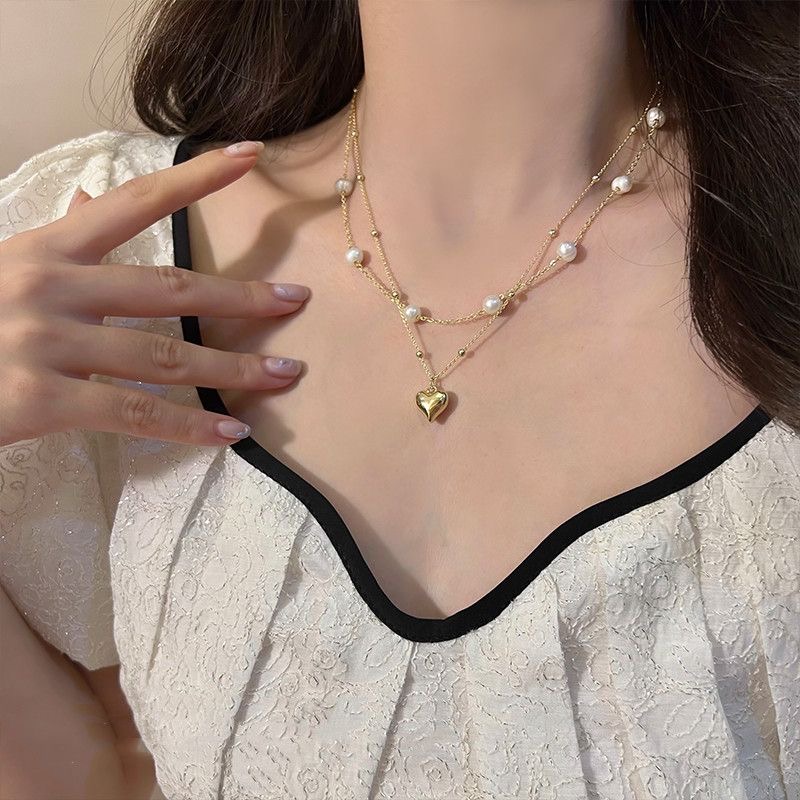 双层爱心珍珠项链2024年新款女气质百搭锁骨链轻奢高级感韩版配饰