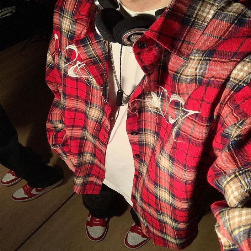 2024秋季美式复古红色格子衫男女长袖字母刺绣外套潮服