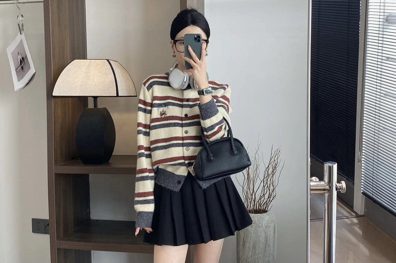 韩国70%羊毛 撞色条纹开衫 美式复古撞色条纹