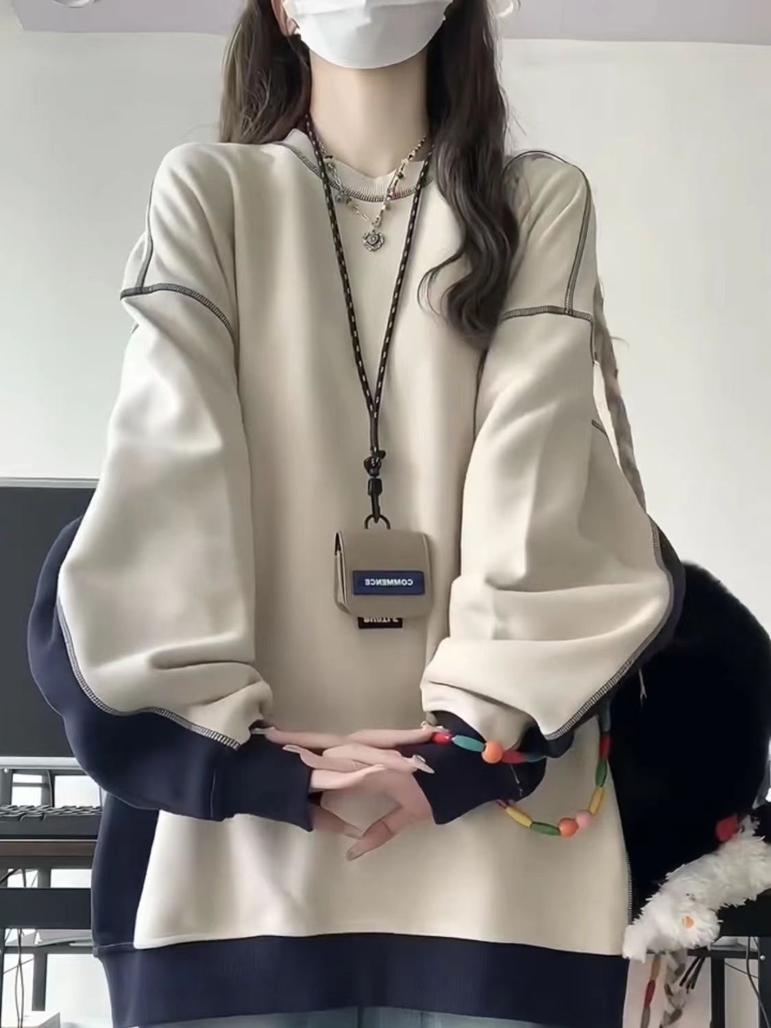 国潮秋冬复古撞色卫衣女圆领宽松oversize拼接宽松上衣外套