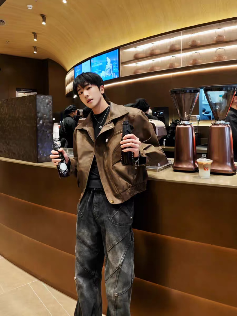 美式高街宽松短款PU皮夹克潮流复古机车棕色外套男女廓形设计潮牌