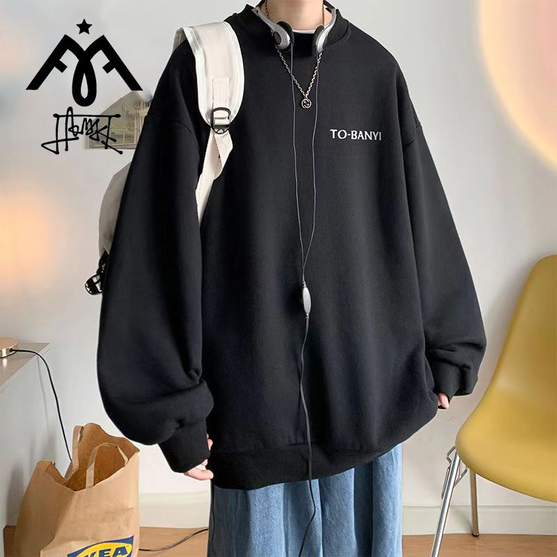 港风重磅圆领含棉卫衣男士2024加绒加厚秋冬宽松潮流美式上衣