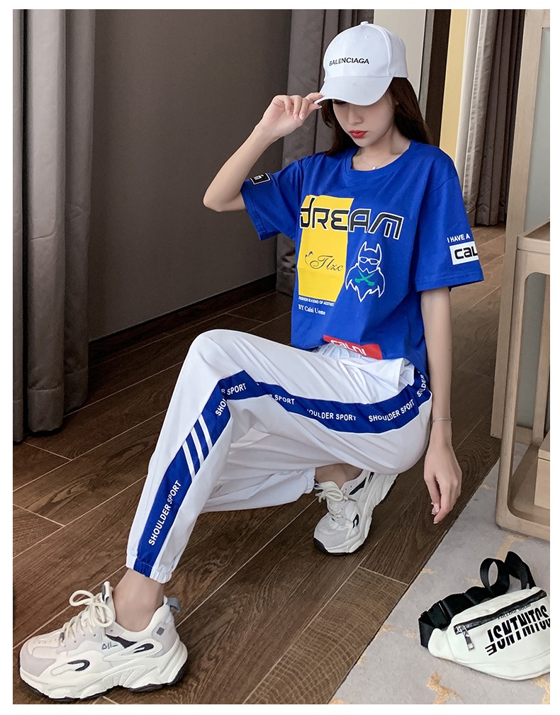 运动服套装女夏季新款时尚潮牌洋气短袖T恤女休闲九分裤中学生两件装 白衣蓝裤