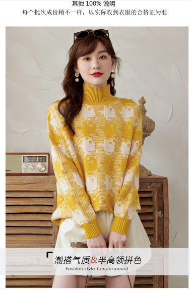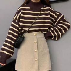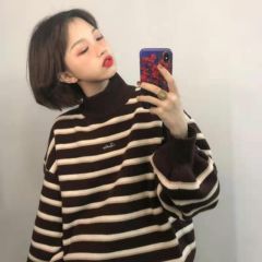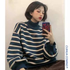 半高领毛衣女加厚外穿秋冬宽松复古套头条纹针衫
