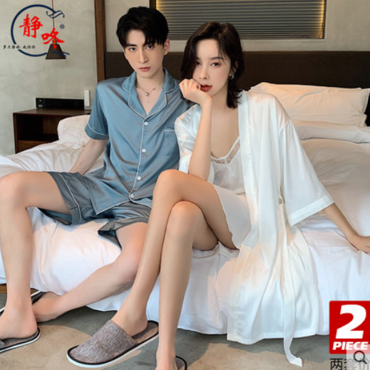 夏季短袖情侣睡衣女冰丝性感两件套男士薄款纯色丝绸家居服夏套装