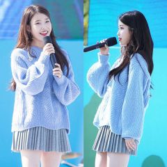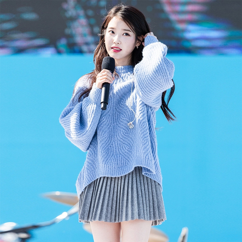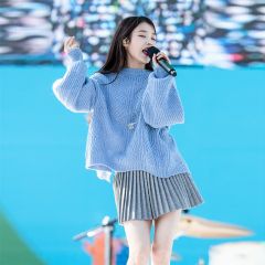 李知恩IU同款蓝色麻花后背开叉毛衣慵懒风针织衫灰色百褶裙套装女