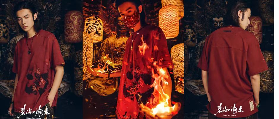 碧海潮生<火神>春夏新款中国风国潮纯棉绣印花水洗短袖t恤男女 水洗红 S