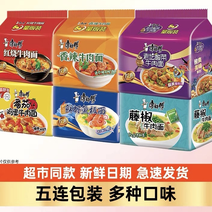 康师傅方便面正宗经典五连包袋装泡面红烧酸菜老母鸡夜宵速食食品