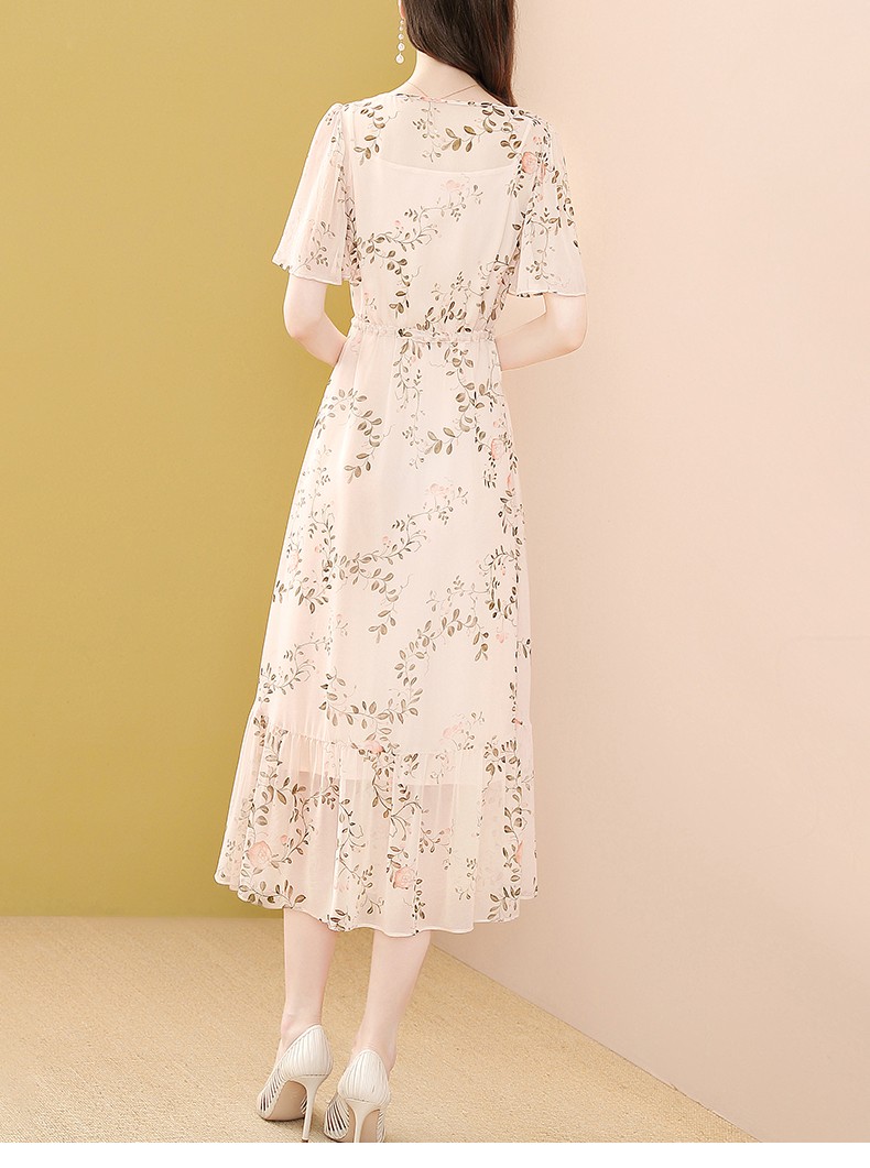 LEDE雪纺连衣裙女装夏装修身显瘦超仙气质中长款小个子碎花裙子夏天短袖衣服潮 S
