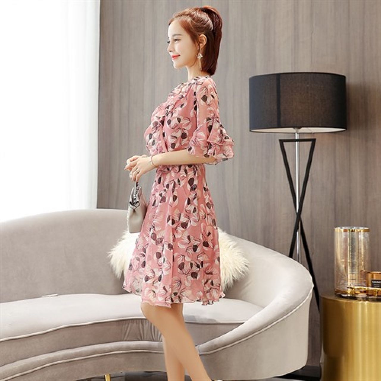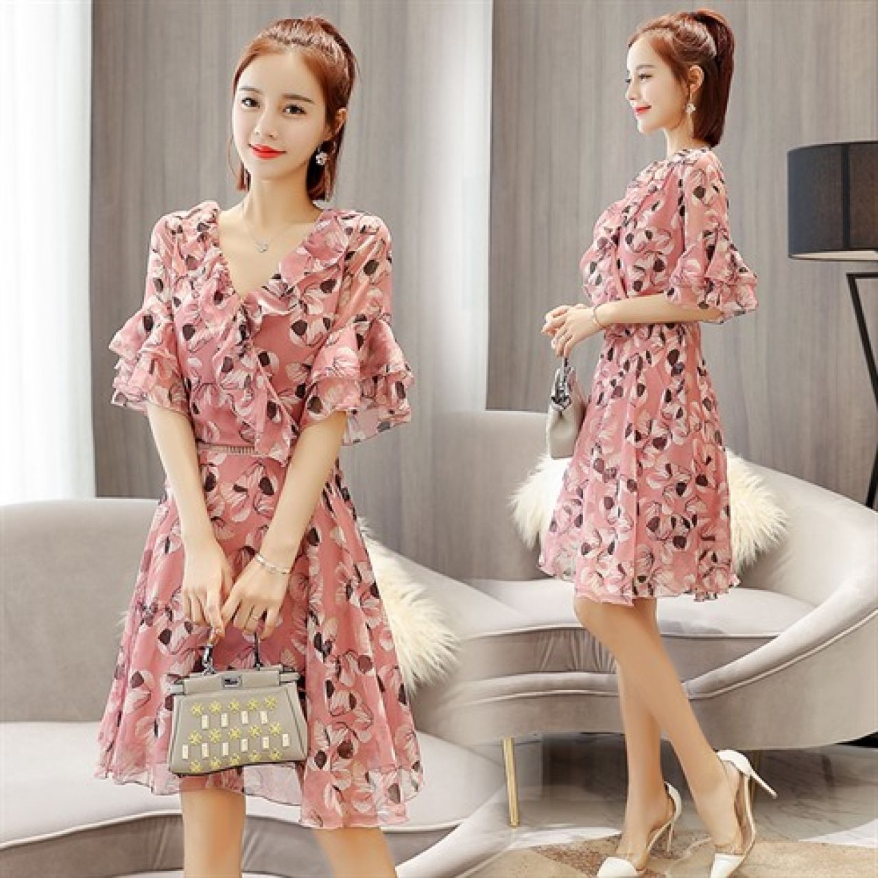 连衣裙V领高腰套头2018年春季长袖中长款时尚都市青春流行百搭修身