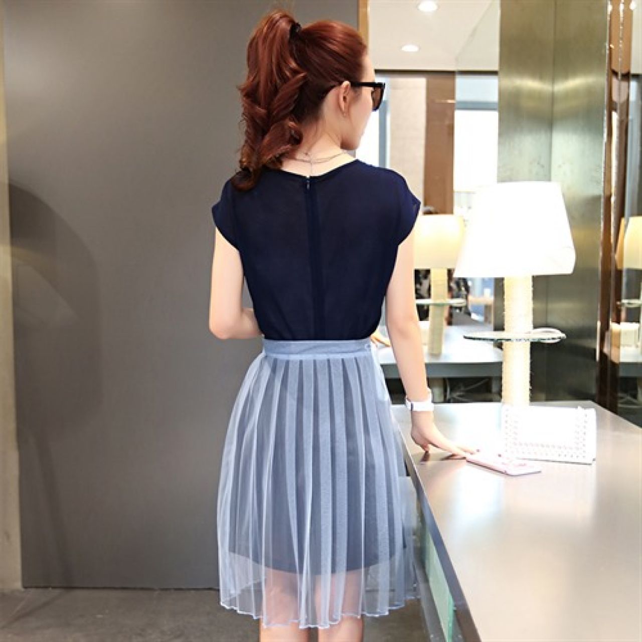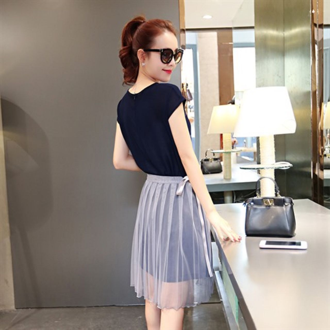 大摆型舒适甜美优雅套头高腰荷叶袖夏季短袖中裙连衣裙