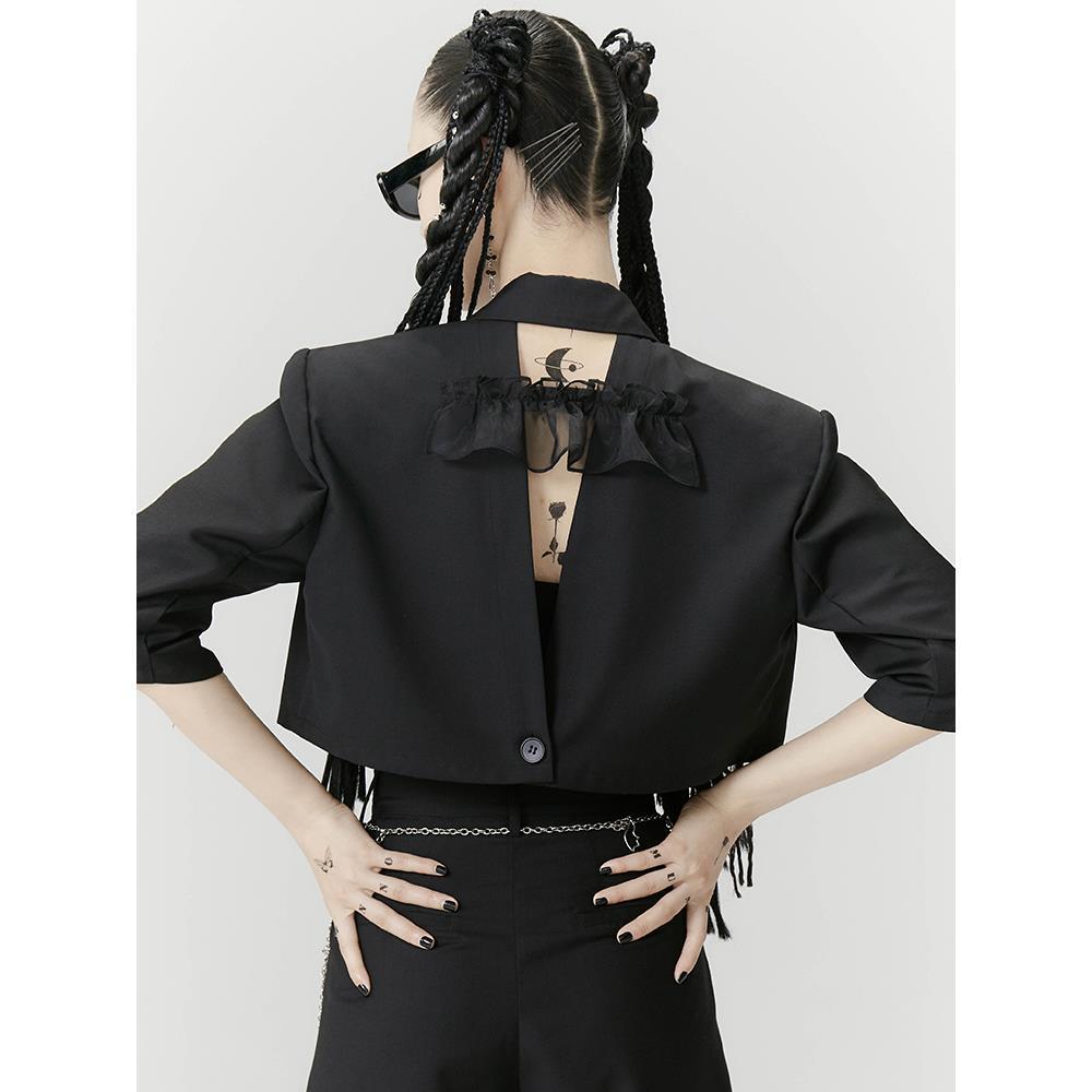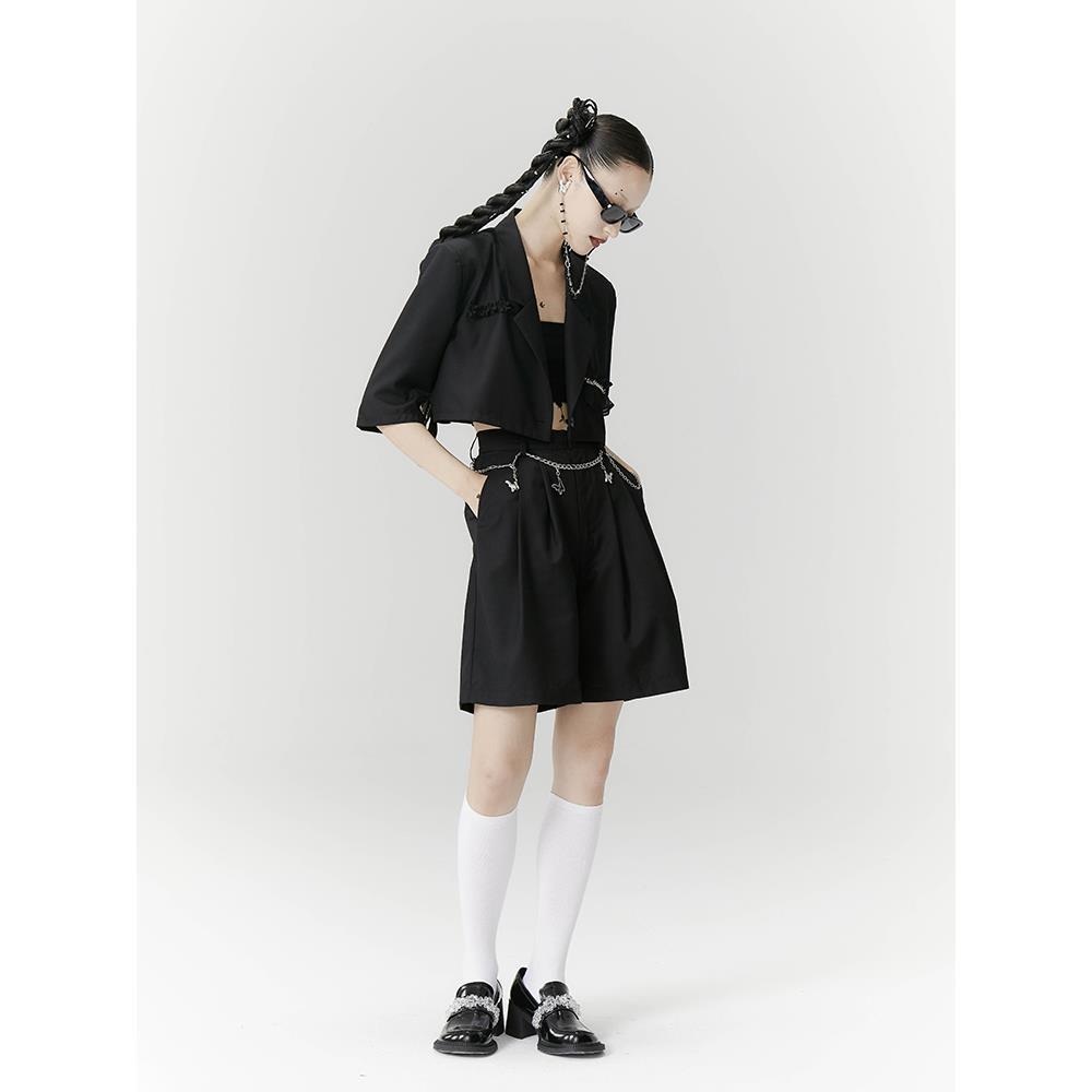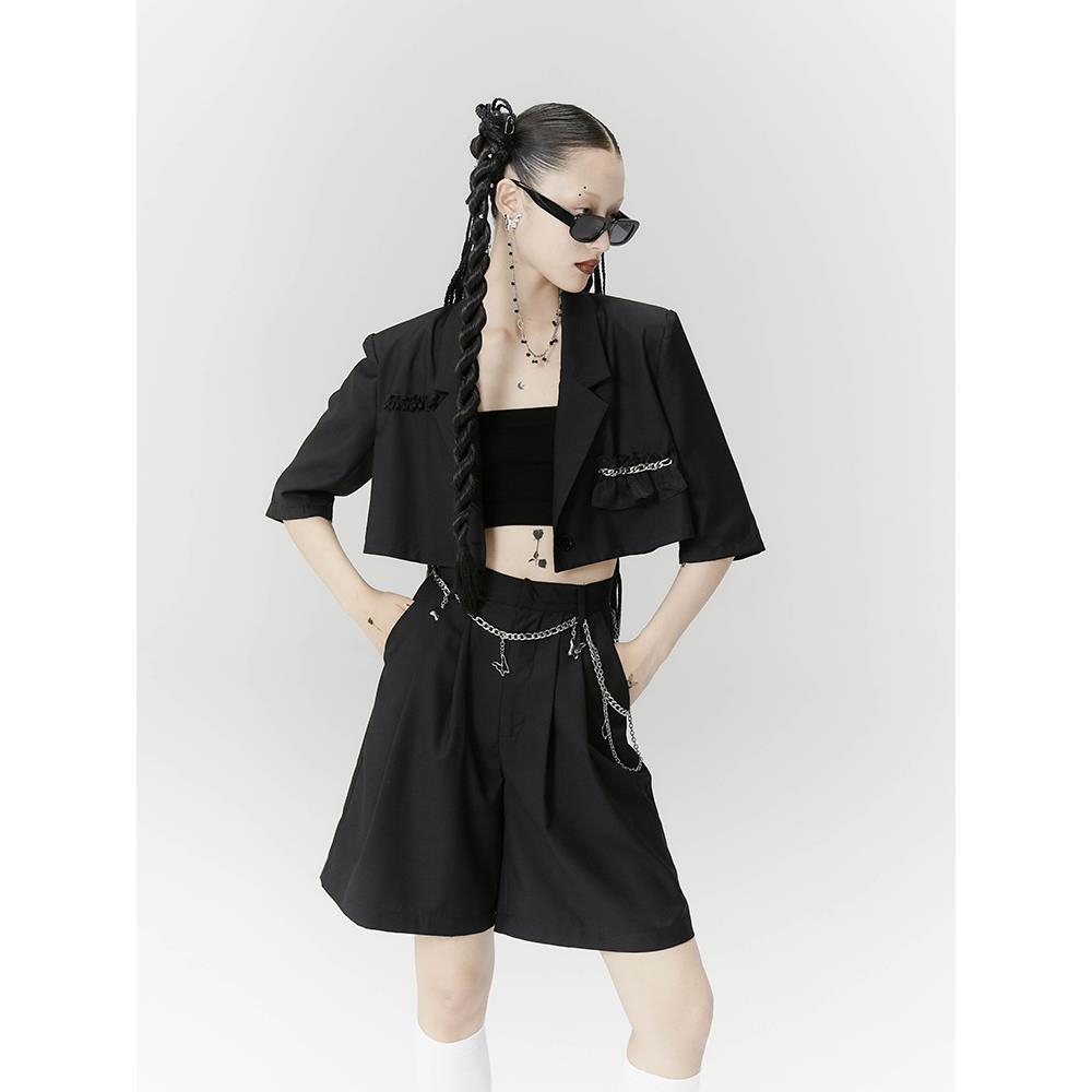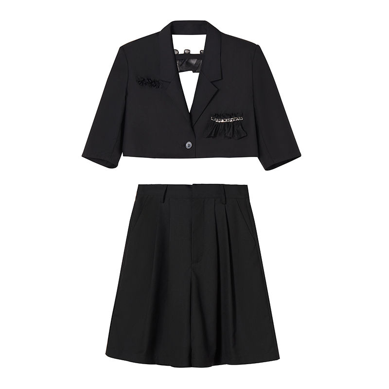 2021夏新款黑色短款短袖背后开衩质感西装套装