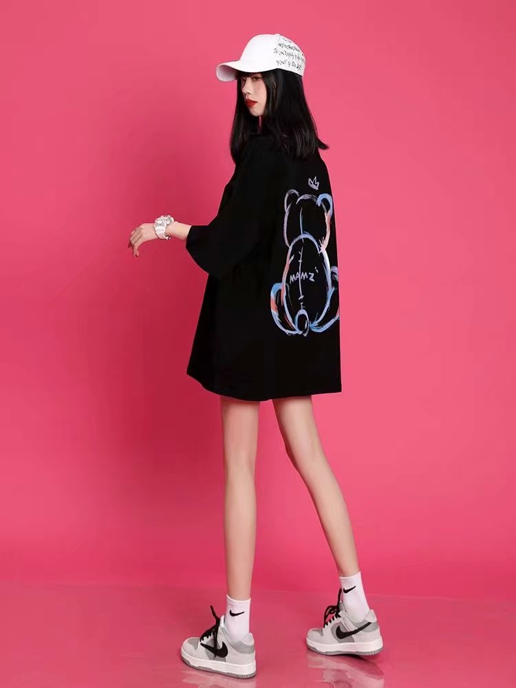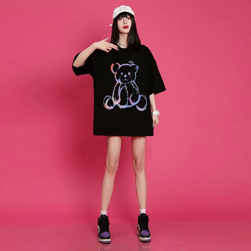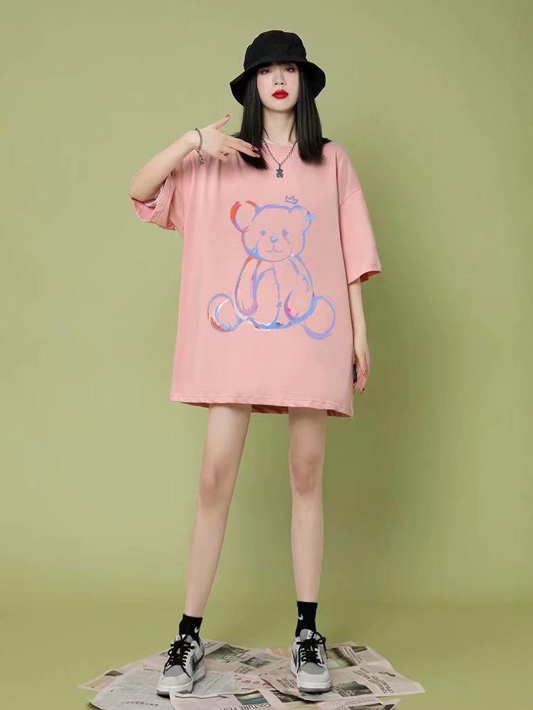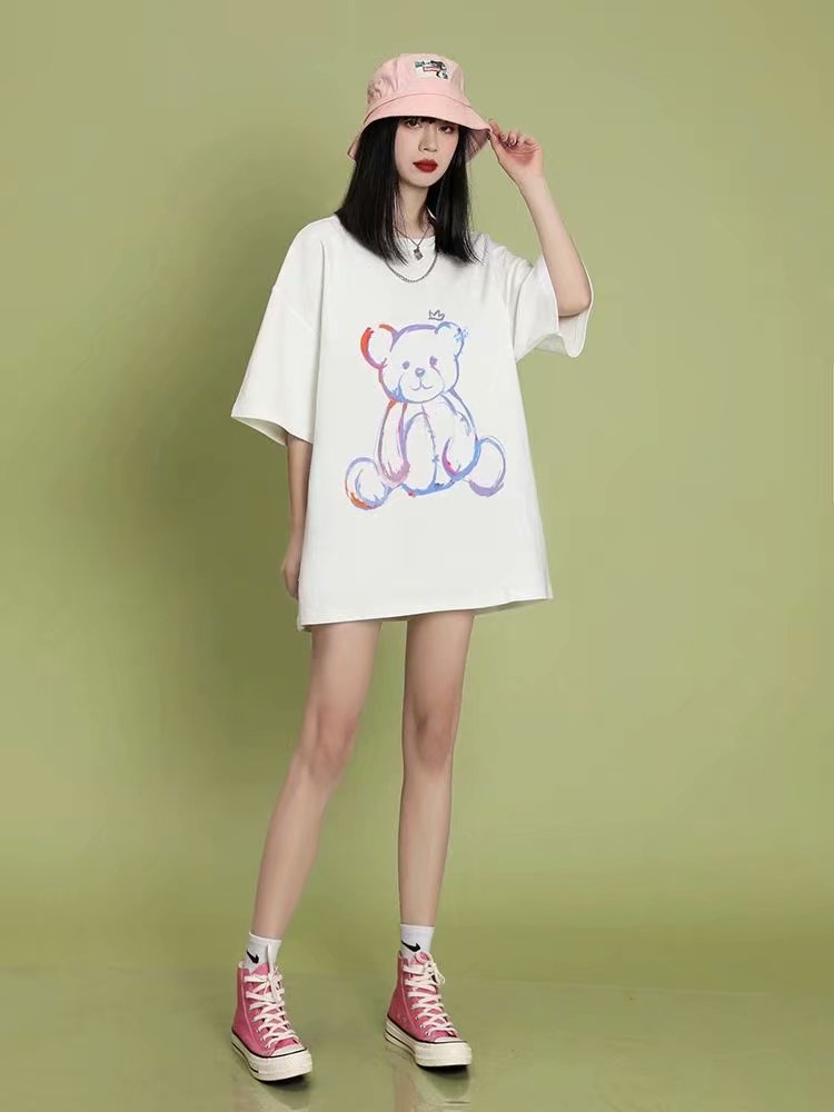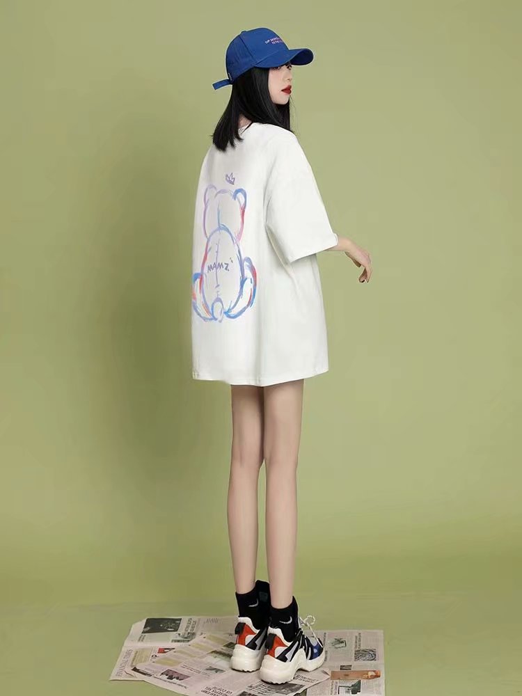 小熊t恤女短袖设计感春夏女潮2021年新款夏季宽松中长款纯棉小众上衣
