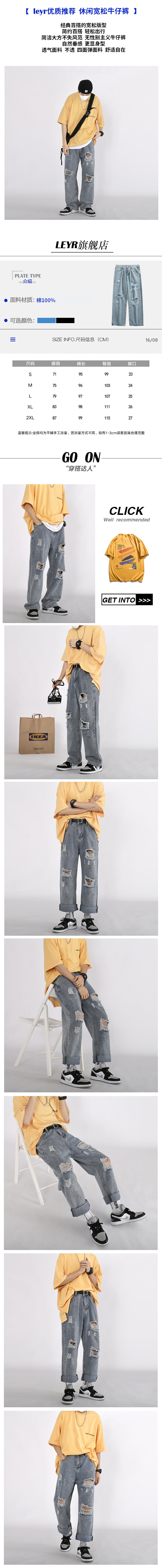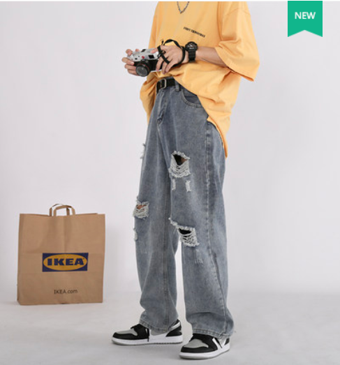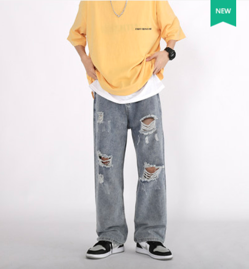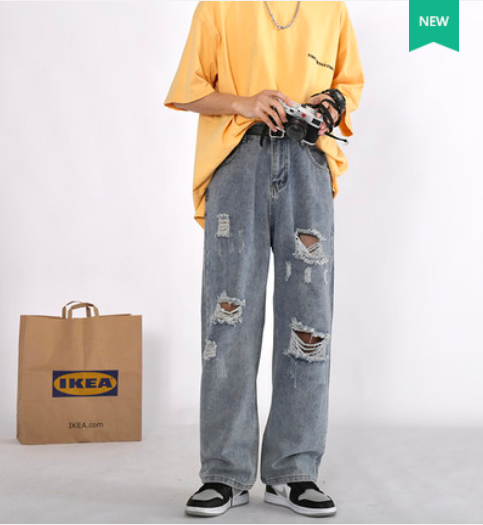 夏季高街乞丐破洞牛仔裤男潮牌做旧水洗割破老爹裤宽松直筒裤子潮